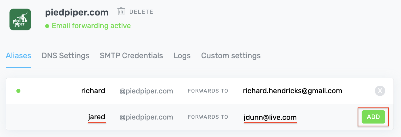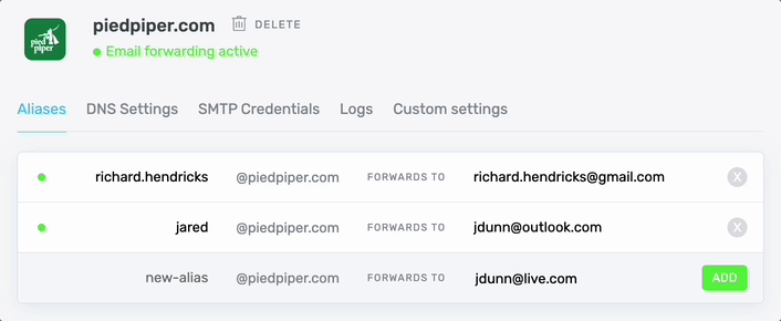 From your ImprovMX aliases page, input your new alias name, a destination address, and click the ADD button.