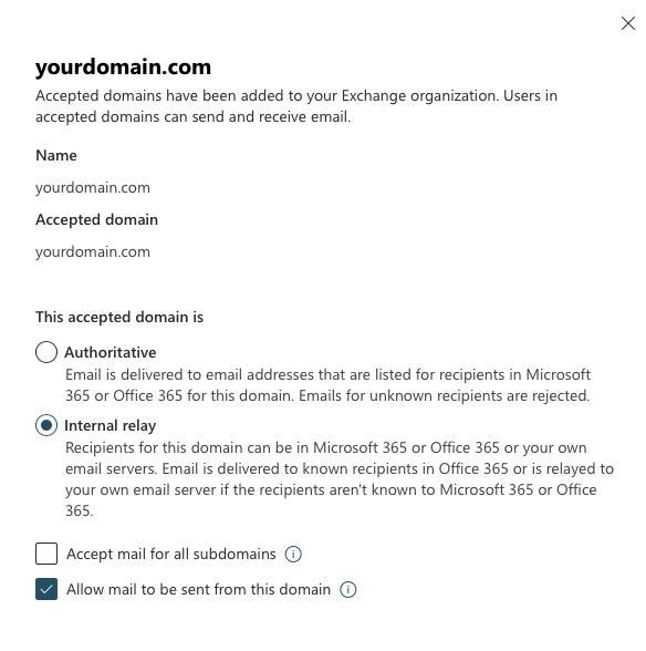 - Action: Set your domain to "Internal Relay" in Microsoft 365 to enable forwarding of emails for unknown recipients.