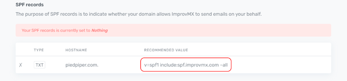 In the ImprovMX dashboard, find the SPF Records section and copy Recommended Value.