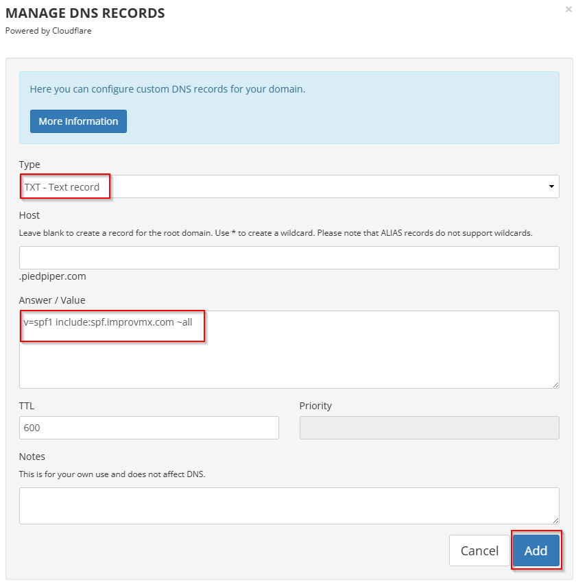 v=spf1 include:spf.improvmx.com ~all(or your recommended value) - TTL - 600
