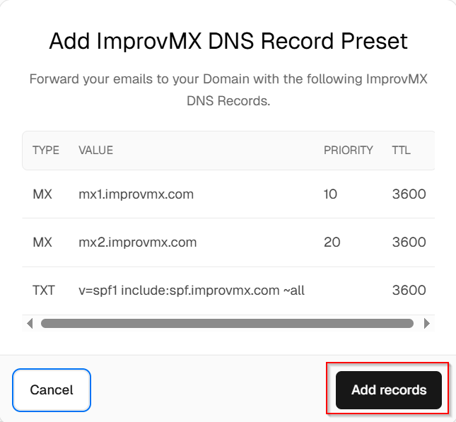MX and SPF records are now added. Remove any non-ImprovMX MX records. Your DNS configuration should match the example below.